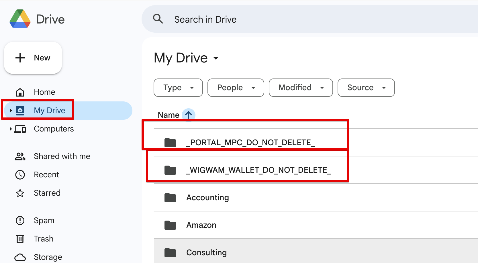 Backup Folder: Verify that the backup folder hasn’t been accidentally deleted. The backup folder should appear in your Google Drive and may be named "_PORTAL_MPC_DO_NOT_DELETE_" or "_WIGWAM_WALLET_DO_NOT_DELETE_"